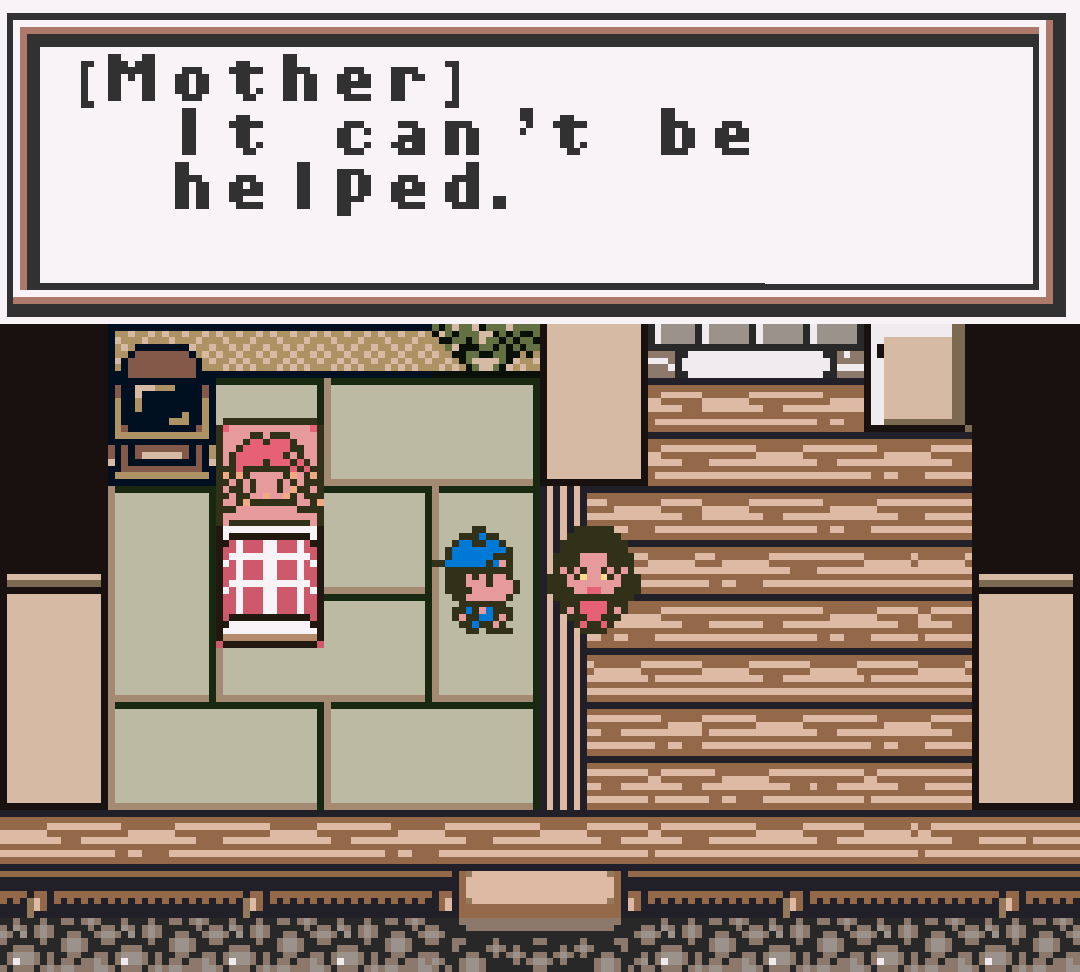 - Strand yourself far from your character’s house. The lone NPC who will give money to your character for free is his own mother: if he approaches her with no money to his name, she’ll give him 20G while sadly muttering, “It can't be helped.” However, you can pin yourself someplace that makes her inaccessible. If you move downriver after you acquire a raft, rest at an inn in another town (which then becomes your respawn point in defeat), and lose all your HP (by beating against the current, say, or by taking a beating from the local wildlife), you won’t have the stamina to row all the way back to her.